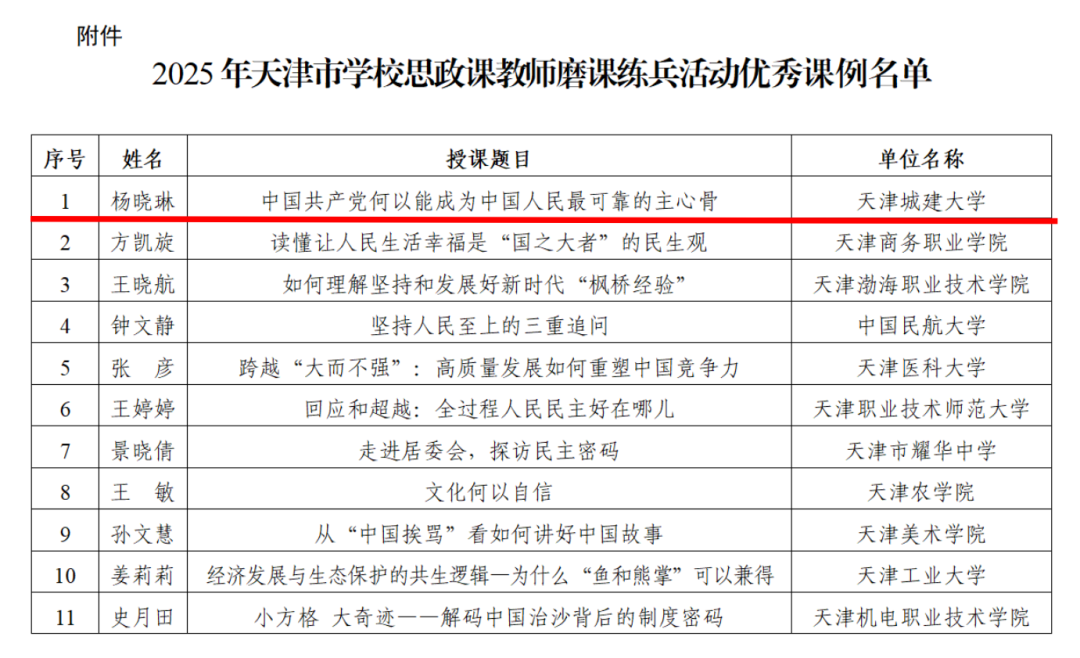 近日,由中共天津市委教育工作委员会、天津市教育委员会主办的“2025年天津市学校思政课教师磨课练兵活动”优秀课例评选结果正式揭晓。我院杨晓琳老师主讲的《中国共产党何以能成为中国人民最可靠的主心骨》一课,凭借扎实的教学功底与极具感染力的课堂呈现,从全市众多参评课例中脱颖而出,成功获评“2025年天津市学校思政课教师磨课练兵活动优秀课例”。