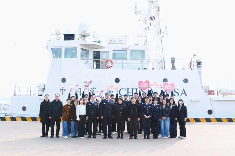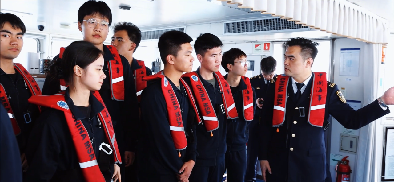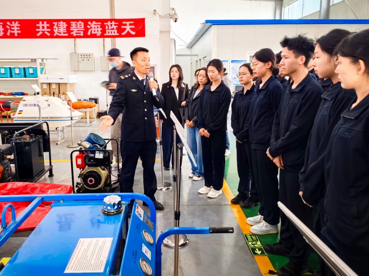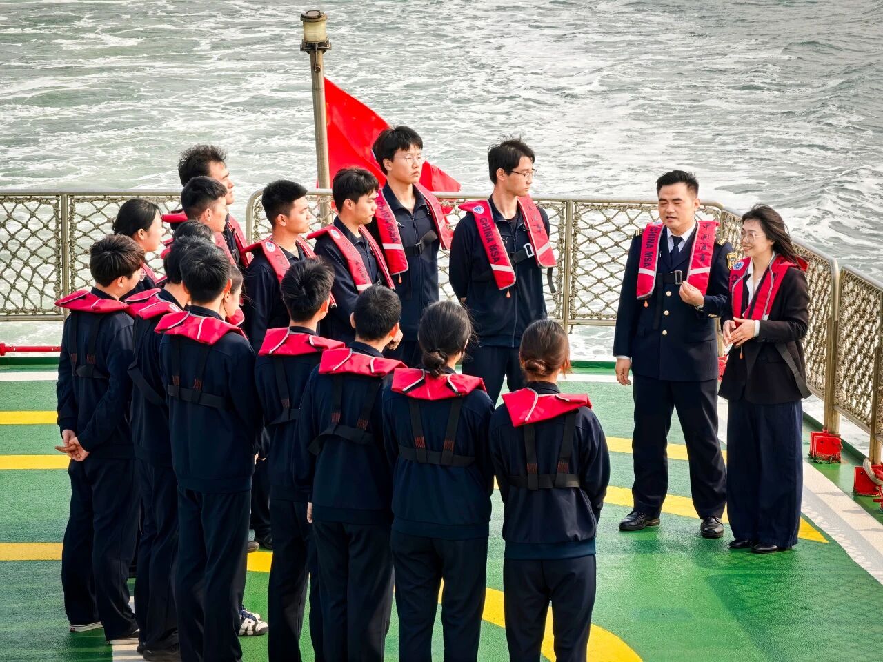 下午,伴随着一声深沉而有力的海巡船汽笛声,探寻之旅迎来了最高潮。师生们穿上救生衣,列队登上停靠在码头的海巡船。甲板上,海风阵阵,浪花拍打着船舷。东疆海事局海上海巡执法大队副队长田海超与我校思政课教师崔梦影紧密配合,在甲板上开启了一场“海味儿”十足的“双师同堂”实地教学。
