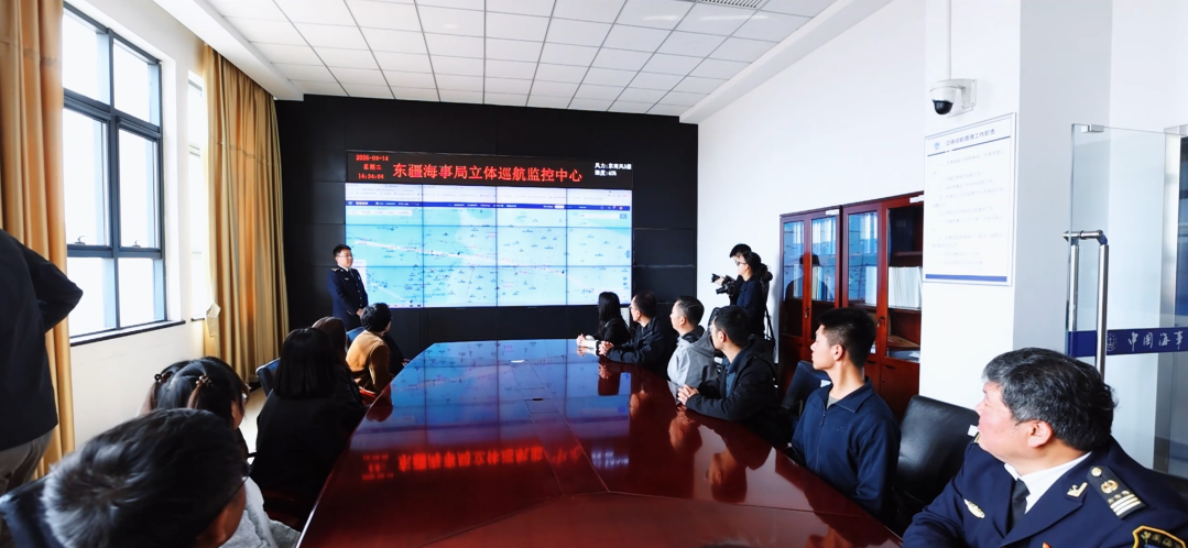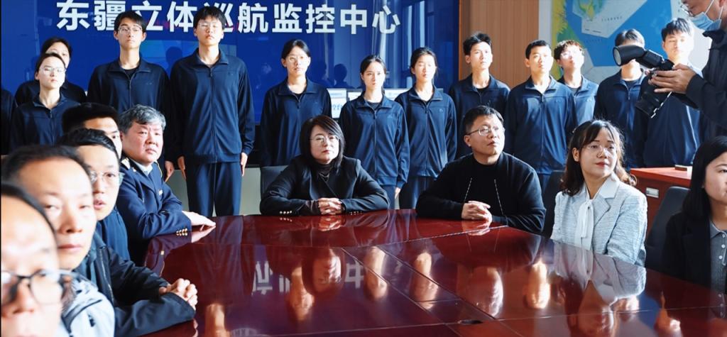 人民城市的高质量发展,离不开科技化治理的保驾护航。走出会议室,师生们的探寻脚步迈入了充满现代科技气息的实地参观区。在立体巡航中心,一整面巨大的电子屏幕闪烁着幽蓝的光芒,密密麻麻的船舶AIS轨迹如同跳动的血脉,清晰勾勒出港口航道的动态全景。东疆海事局的讲解员指着屏幕,向大家展示了“全方位覆盖、全天候运行”的信息化动态监管网络。学生们目不转睛地看着这些跃动的数据,直观感受到它们正是守护人民城市运转的“智慧之眼”。